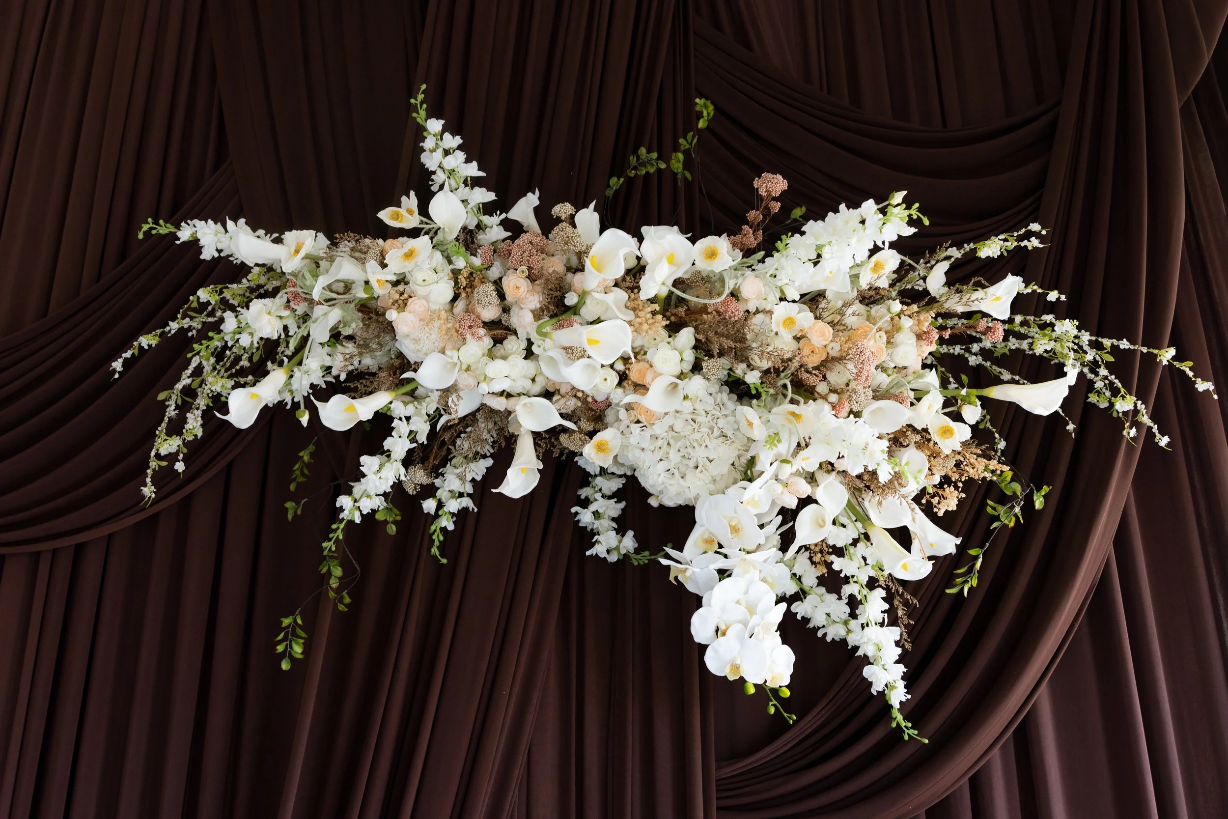 We’ve welcomed a seasonal refresh at the studio with a rich chocolate drapery installation, layered with soft white florals for a refined spring moment. The warm tones of the draping create depth and elegance, while the fresh white blooms bring balance, light, and a subtle softness to the space.